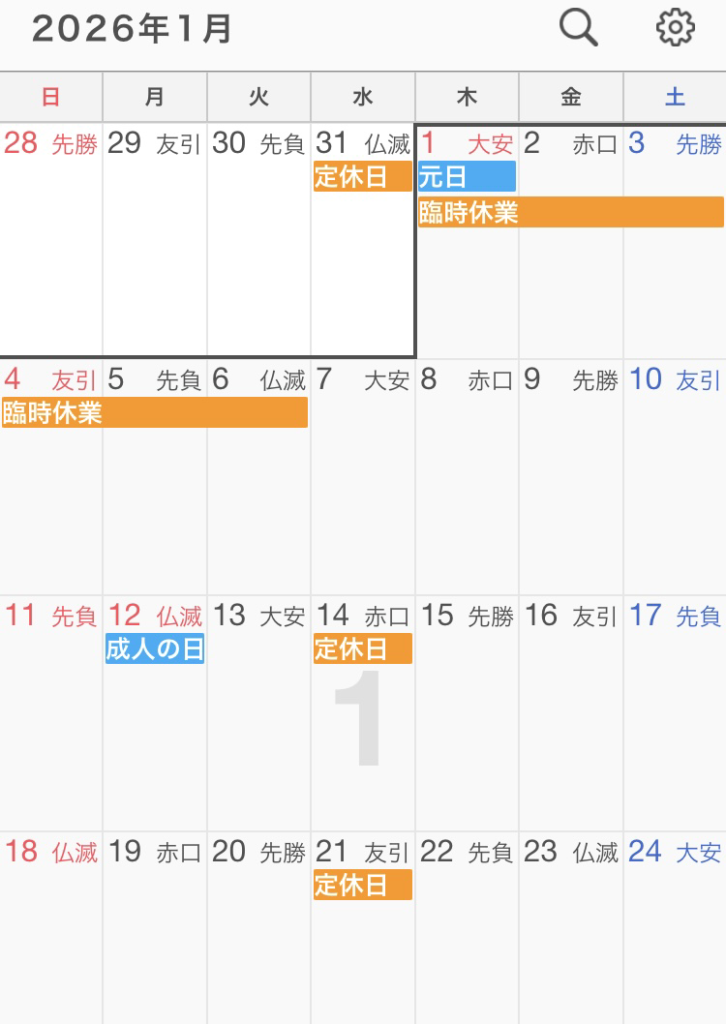 HOME > お知らせ > お知らせ 年末年始・1月のお休み 2025年12月15日 年末年始は31日~6日までがお休みになり、7日(水曜)から営業しております。 その他1月は水曜定休のみです。よろしくお願いします。 -お知らせ